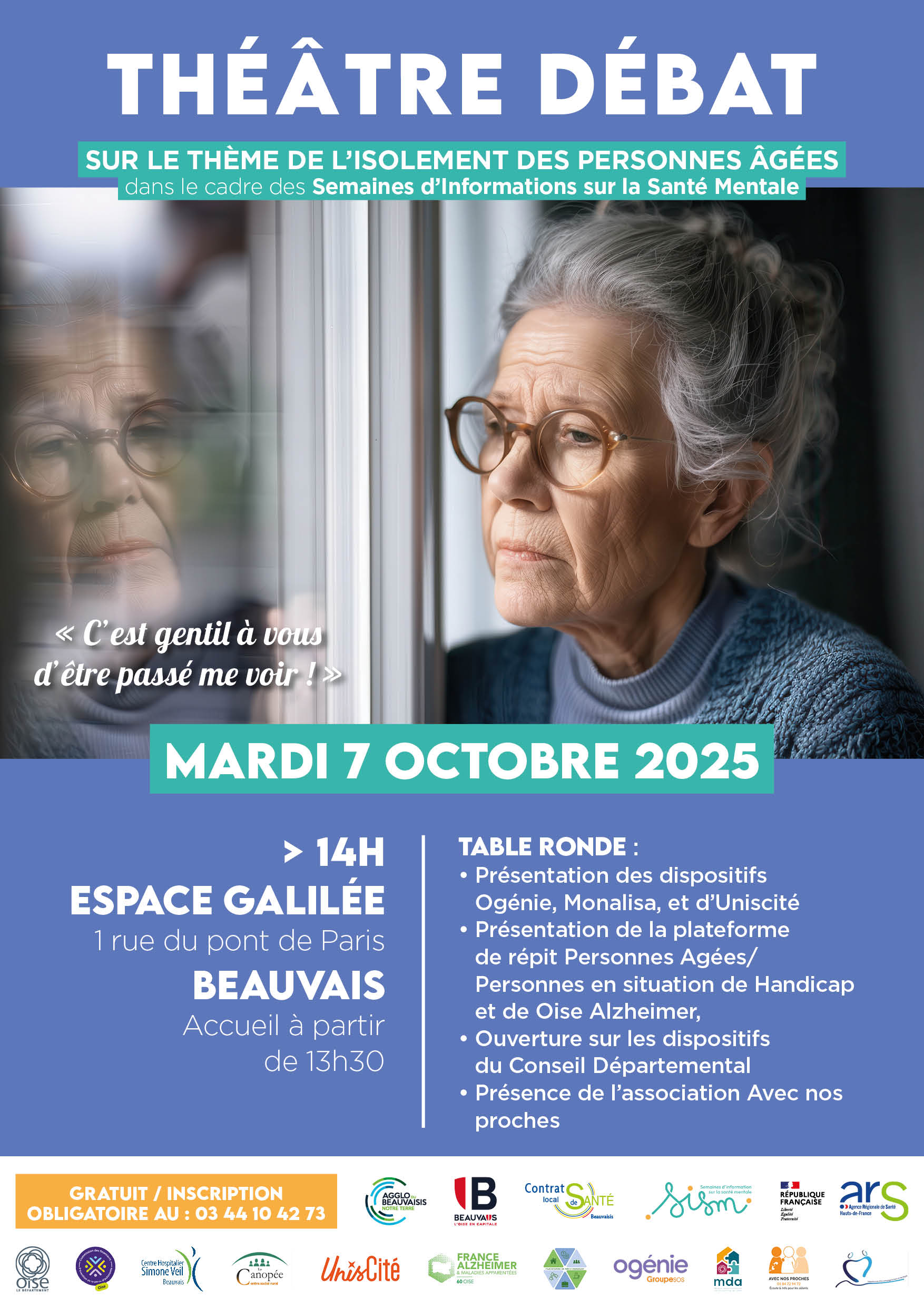 Le Conseil Local de santé mentale, le Conseil Départemental de l’Oise et la Plateforme d’accompagnement et de répit des aidants du territoire Oise Ouest sont ravis de vous inviter au débat théâtral ayant pour thème l’isolement des personnes âgées et des aidants familiaux, ainsi qu’à la table ronde qui suivra permettant de mettre en lumière le déploiement des solutions locales pour y remédier.